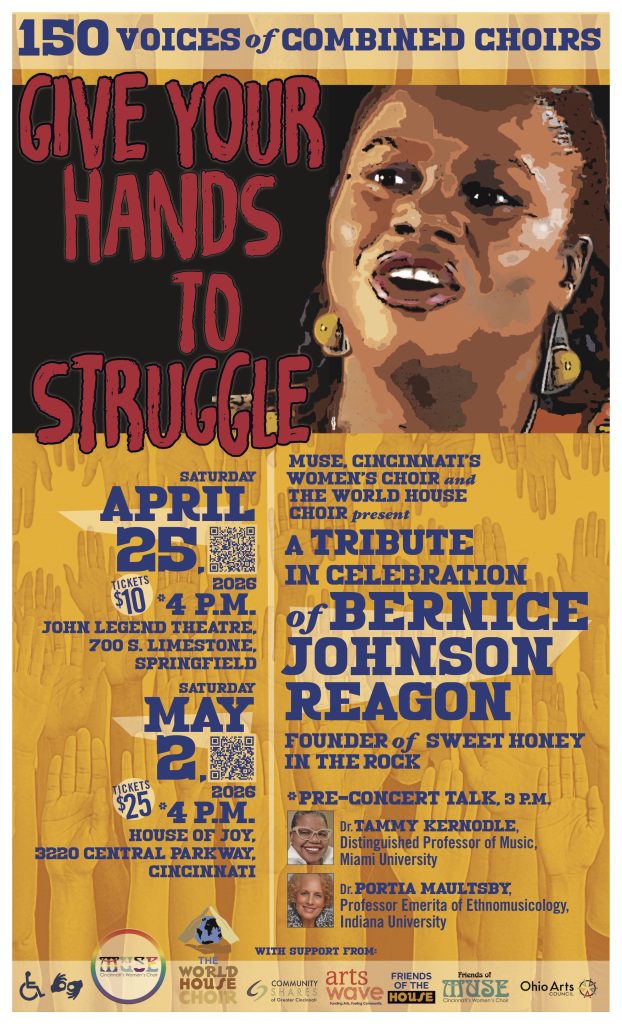 The concert, entitled “Give Your Hands to Struggle,” features performances by each choir as well as a collaborative presentation of Liberty or Death Suite, an original work by Dr. Reagon about Harriet Tubman commissioned by MUSE in 2004 for the opening of the National Underground Railroad Freedom Center in Cincinnati.